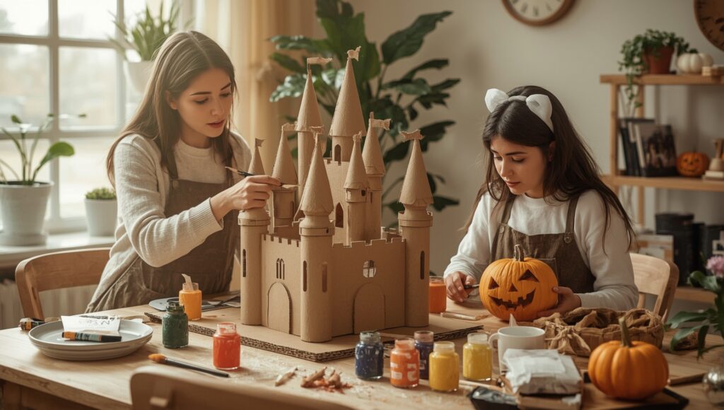Por exemplo, transformar caixas de papelão em castelos ou cemitério fake, criar abóboras pintadas ao invés de esculpi-las, ou confeccionar acessórios com tecidos antigos. Essa abordagem não só ajuda o planeta, mas também valoriza o toque artesanal e único em cada detalhe da celebração.