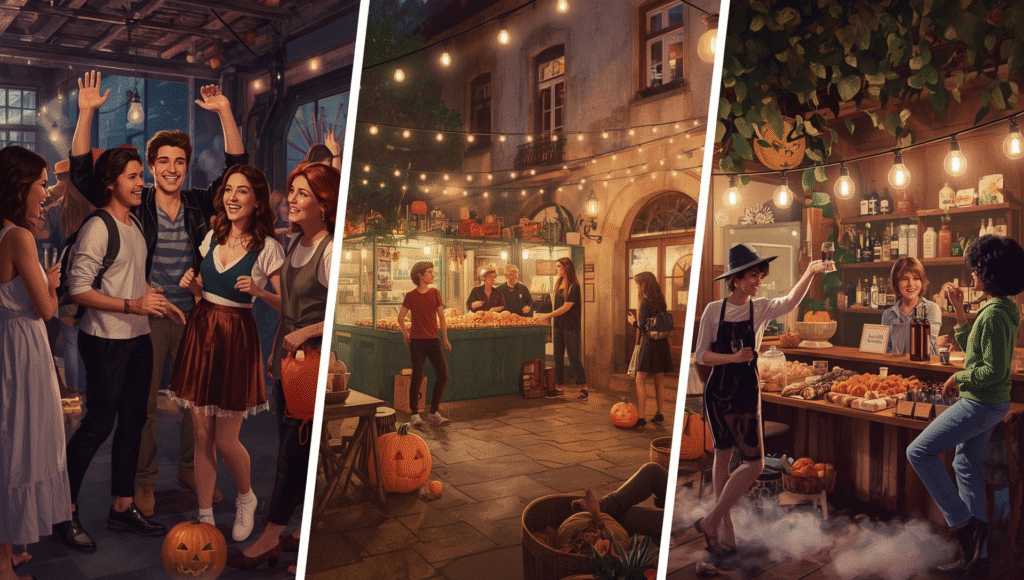 Em várias cidades do mundo, eventos trazem salas temáticas com realidade aumentada, onde os convidados enfrentam desafios e enigmas. Já nas celebrações mais intimistas, a proposta é criar ambientes acolhedores, com música suave, projeções de sombras nas paredes e comidas inspiradas na estação: tortas de abóbora, chocolates artesanais, drinks coloridos e até pratos veganos temáticos.